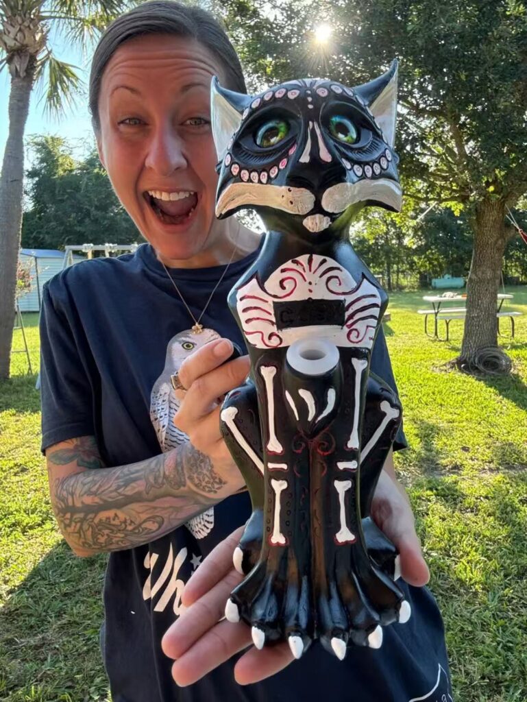 | Description | This 9.4" Gothic Cat Water Pipe is a masterpiece of eerie elegance, blending dark fantasy with exquisite craftsmanship. Made of durable PVC and glass, it features intricate skeletal patterns and hauntingly expressive eyes. The 14mm glass bowl and downstem ensure a smooth smoking experience, making it a must-have for collectors and enthusiasts alike. |