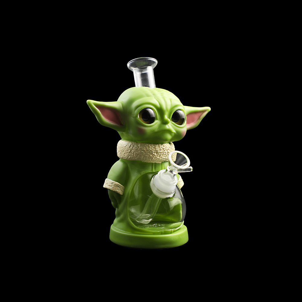 Perched in contemplation atop his 5.2" forest-stump base, this 8.3-inch vinyl Yoda emerges in wise jade hues, every 210mm PVC fold capturing the master's iconic posture. Glass components nest within, seamlessly paired with the included 14mm bowl and downstem. A compact relic for devotees seeking Jedi essence in water pipe form.