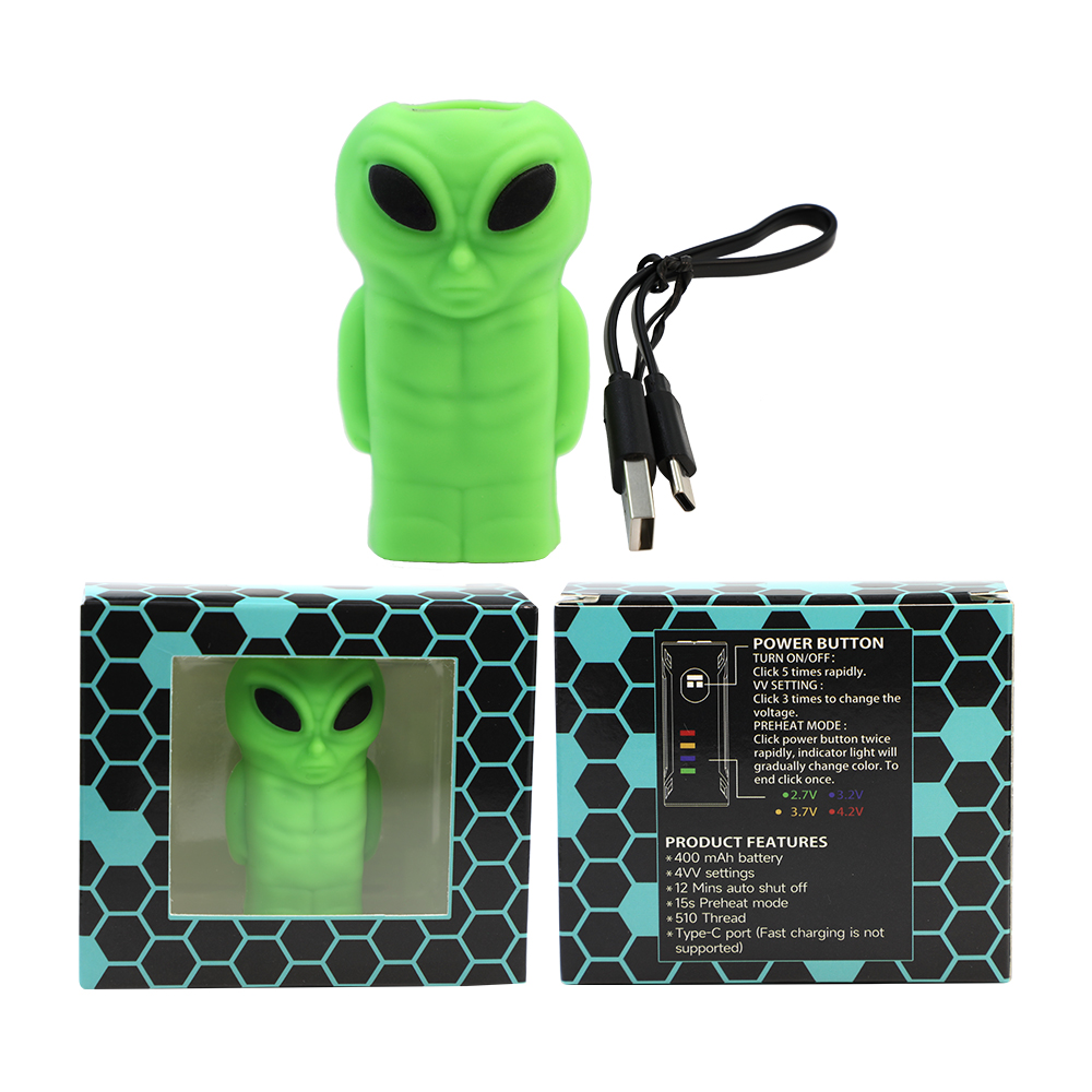 | Description | Explore the unknown with the YHS Smoke Little Green Men (LGM) Silicone CBD Battery Device. Compact and lightweight at just 36g, this alien-inspired design is both fun and functional. Made from durable silicone, it’s easy to carry and built for everyday use. Includes a USB charging cable for convenience, making it perfect for CBD fans who love unique gear. Add some out-of-this-world style to your collection. Note: Atomizer not included. |